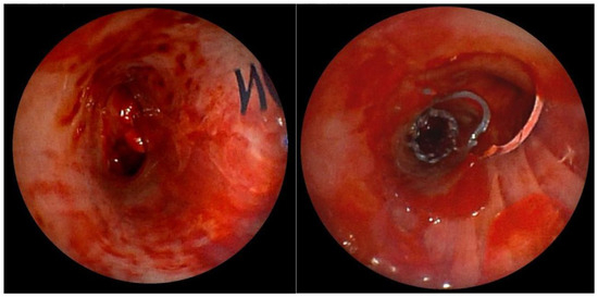 After mechanical disobliteration of tumor masses using a cryoprobe, it was possible to insert a Y stent. We adjusted the Dumon stent (16 × 30 × 30) according to the distance measurements using the LJ system (Figure 4). Subsequently, a “stent into stent” (Microtech t 12 × 20) was inserted into the right lower bronchus for torsional changes, twisting the distal part of the right arm of the original Dumon stent.