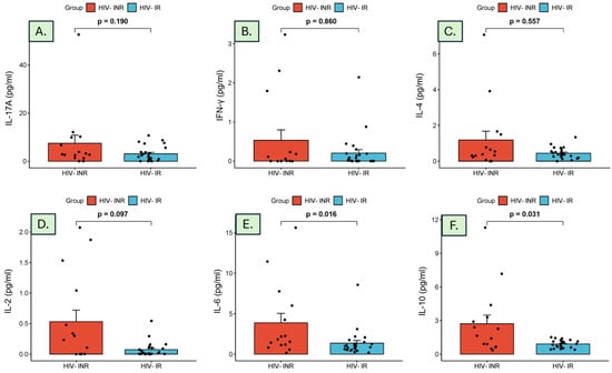 Distribution of cytokine levels among HIV-INR and HIV-IR groups: (A) IL-17A, (B) IFN-γ, (C) IL-4, (D) IL-2, (E) IL-6, and (F) IL-10 levels.