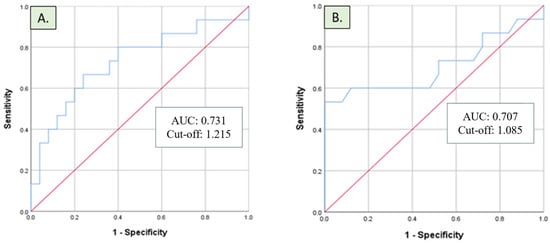The diagnostic performance of IL-6 was assessed by the ROC curve, with an area under the curve (AUC) of 0.731 indicating moderate discrimination (Figure 2A). On the other hand, IL-10 levels were higher in INR patients (1.65 pg/mL vs. 0.92 pg/mL; p = 0.03), with an AUC of 0.707 (Figure 2B). The AUC of a ROC curve provides a measure of the discriminative ability of a diagnostic test. Therefore, an AUC of 0.731 for IL-6 and of 0.707 for IL-10 indicate fair discrimination, suggesting potential clinical utility for IL-6 and IL-10 as biomarkers for HIV-INR.