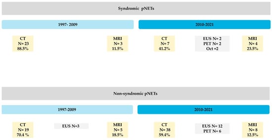 Syndromic Cases: MDCT was historically used as the primary modality in 88% of syndromic cases; however, it had a 38% reduction in utility for symptomatic patients. Meanwhile, MRI’s utility increased from 12% to 43%. EUS, which had no utility in the first decade for pNET detection, grew in popularity by 7% in symptomatic patients during the second decade. CT remains the imaging modality of choice, but there is a growing role of EUS in localizing pancreatic lesions in syndromic patients.