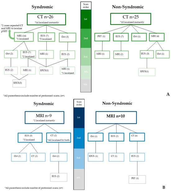 The two most commonly utilized modalities—CT (A) and MRI (B)—and their detection advantages in pNETs, with frequent pathways corresponding to clinical symptoms of patients. IOUS is an abbreviation for intra-operative ultrasound.