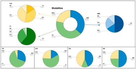 Multi-modality contributions to pNET surveillance, in consecutive order. The top box shows popularity among scans in surveillance is reflected in the doughnut chart with specific modality divisions. These are then divided into initial or follow-up orders as represented in 2D pie charts. MRI (blue), CT (green), EUS yellow. The bottom figure shows proportion of modalities contributions in pNET surveillance.