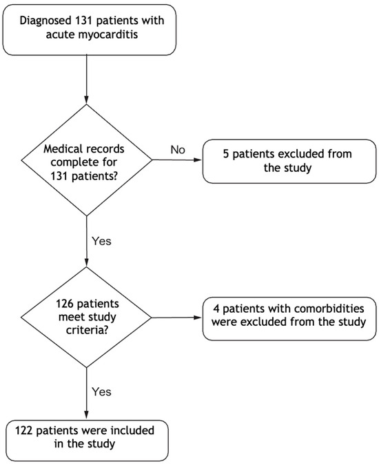 This study was retrospectively designed to evaluate patients aged between 1 month and 18 years who underwent treatment for myocarditis in our pediatric cardiology clinic between 1 January 2022 and 31 December 2024. Patients with congenital heart disease, inflammatory or autoimmune diseases, cancer, or incomplete data were excluded.