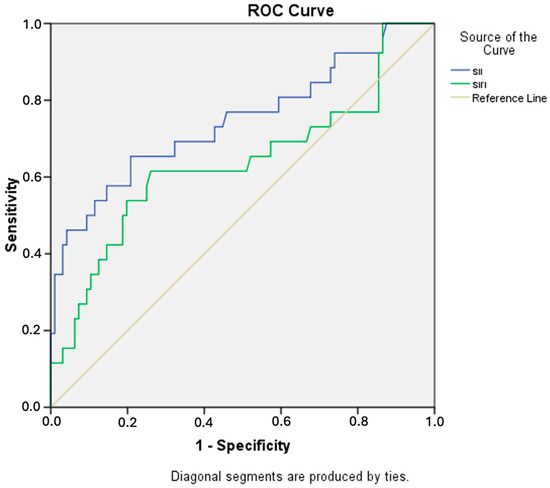 Receiver operating characteristic (ROC) curves for inflammation markers as predictive indicators of fulminant myocarditis. Figure shows ROC curves for SII and SIRI in predicting fulminant myocarditis.