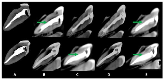 Sagittal slices obtained for the evaluation of artifacts. Volumetric distortion or blooming is indicated by green arrows, showing the actual outline of the filling material. The acquisition protocols are represented by (A) micro-CT imaging, (B) Eagle 3D HD, (C) Eagle 3D ST, (D) OP 300 HD, and (E) OP 300 ST. A higher expression of dark streaks and hypodense areas can be observed in the images (B–E).