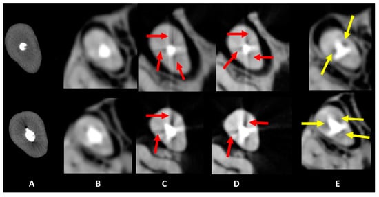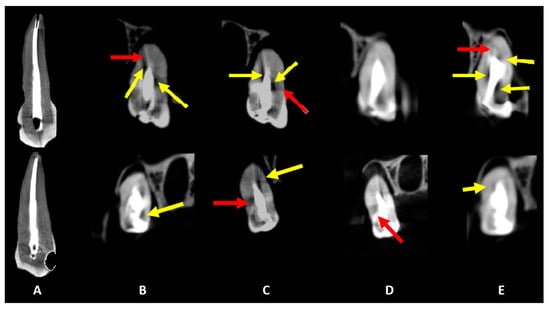 Axial slices obtained for the evaluation of artifacts. Dark streaks and hypodense areas are identified by red and yellow arrows, respectively. The acquisition protocols are represented by (A) micro-CT imaging, (B) Eagle 3D HD, (C) Eagle 3D ST, (D) OP 300 HD, and (E) OP 300 ST. A higher expression of dark streaks and hypodense areas can be observed in the images (B–E).