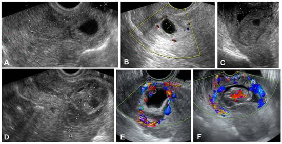 All ultrasound images at admission were retrieved from medical records. All stored images demonstrated the gestational sac or conceptual tissues within a cesarean section scar (Figure 1). Grayscale and/or color Doppler transvaginal ultrasound (Voluson Expert 22, E10 and E8 (GE, Tiefenbach, Zipt, Austria), Medison Accuvix XQ (Seoul, Republic of Korea)) was used, and the diagnosis was determined by the Society for Maternal–Fetal Medicine Consult Series criteria and the modified Delphi method [1,6]. We defined “hypervascularity” in cases where there was a profuse vascular pattern around cesarean scar pregnancy in color Doppler images (Figure 1E,F). In the absence of color Doppler images, it was not possible to analyze the presence of hypervascularity.