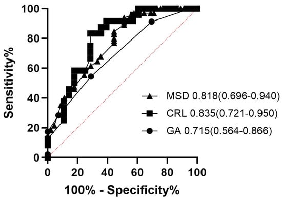 The ROC analysis results for the prediction of successful first-line treatment without adjunctive therapy or transfusion were 0.715 (95% CI 0.564–0.866 p < 0.001), with an estimated best cutoff range of 6.5 gestational weeks, a sensitivity of 70.4%, and a specificity of 61.1%; 0.835 (95% CI 0.721–0.950), with an estimated best cutoff of 0.52 cm crown–rump length, a sensitivity of 74.1%, and a specificity of 83.3%; and 0.818 (95% CI 0.696–0.940), with an estimated best cutoff of 2.45 cm mean sac diameter, a sensitivity of 74.1%, and a specificity of 83.3% (Figure 3).