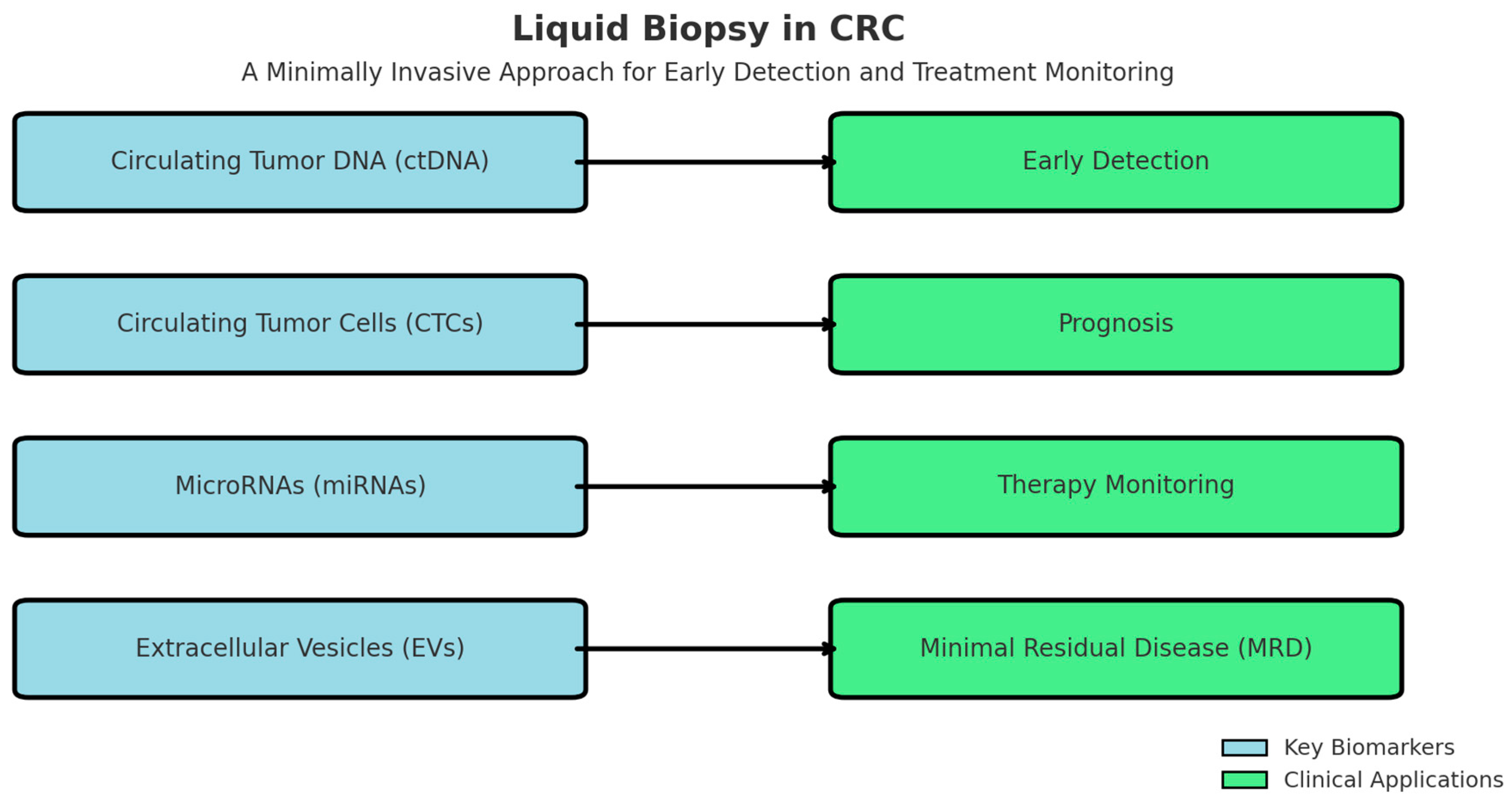 | ctDNA has gained prominence as a highly specific biomarker for CRC detection. It allows for mutation profiling, treatment response assessment, and minimal residual disease (MRD) detection. | CTCs are cells shed by the primary tumor into the bloodstream, providing real-time insights into metastasis and treatment response. | miRNAs such as hsa-miR-21-5p and miR-221-3p have been identified as potential diagnostic biomarkers in CRC [51]. | EVs secreted by tumor cells carry oncogenic cargo, including proteins, DNA, and RNA, which can serve as diagnostic tools for early-stage CRC detection [52]. |