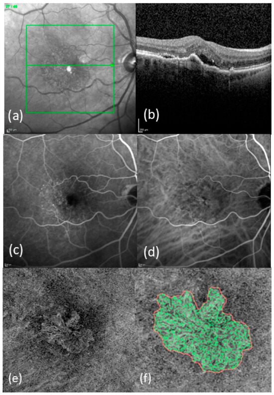 Typical images from patients with newly diagnosed nAMD: (a) IR-image with OCT line; (b) SD-OCT image; (c) FA; (d) ICGA; (e) en-face OCTA in ORCC segmentation; (f) enlarged and binarized MNV (red line = boundary of the MNV, green lines = vessels of the MNV).