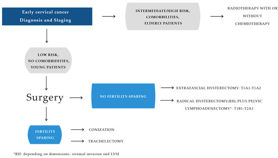 - Schmeler, K.M.; Pareja, R.; Lopez Blanco, A.; Humberto Fregnani, J.; Lopes, A.; Perrotta, M.; Tsunoda, A.T.; Cantú-de-León, D.F.; Ramondetta, L.M.; Manchana, T.; et al. ConCerv: A prospective trial of conservative surgery for low-risk early-stage cervical cancer. Int. J. Gynecol. Cancer 2021, 31, 1317–1325. [Google Scholar] [CrossRef]