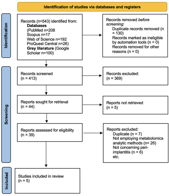 The existing literature was electronically searched using the following databases and registries: PubMed, Scopus, Web of Science, ProQuest, and Google Scholar. The electronic literature search was designed and conducted by two independent researchers (AMC and CDC), starting from 21 January 2025 until the final date of 30 January 2024. The search strategy included the terms ‘peri-implantitis’ and ‘metabolomics’, applied using Boolean operators (AND/OR) in title, abstract, and full-text searches. When available, MeSH terms were included in the search. No date restrictions or language restrictions were applied during the search. This strategy was applied with minor necessary modifications to the queries to accommodate the search particularities and controlled vocabularies of each database. The exact search terminologies are available in Appendix A—Search strategy.