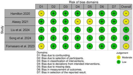ROBINS-I (“Risk Of Bias In Non-randomised Studies—of Interventions”) scale was used to assess the risk of bias. This scale assesses the risk of bias in 7 domains: bias due to confounding, study participants’ selection, classification of interventions, deviations from intended interventions, missing data, measurements of outcomes, and reporting. Each domain was assessed using the tool guidelines and summarised under the labels proposed by the tool. To generate a visual summary of the assessment, we used the robvis tool to generate a traffic-lights graph [28,29].