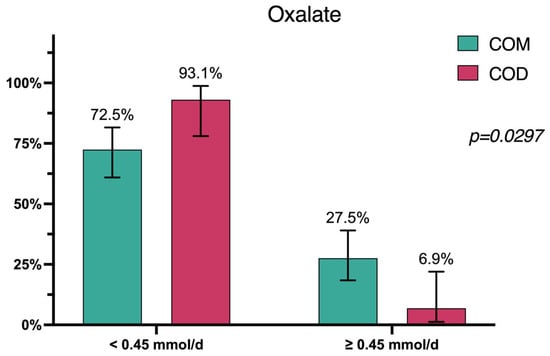 Assessing the proportion of patients whose parameter values deviated from the designated reference values between the groups, we found that oxalate concentration was the only parameter that had statistically significant intergroup differences (p = 0.0297) with 27.5% of patients (n = 19, 95% CI 18.4–39.1) having hyperoxaluria in Group A vs. 6.9% (n = 2, 95% CI 1.2–22.0) in Group B (Figure 1).