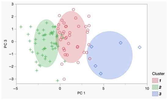Biplot diagram of the identified clusters in the principal component coordinates. Each point represents an individual observation: green crosses correspond to Cluster 1, red circles to Cluster 2, and blue squares to Cluster 3.