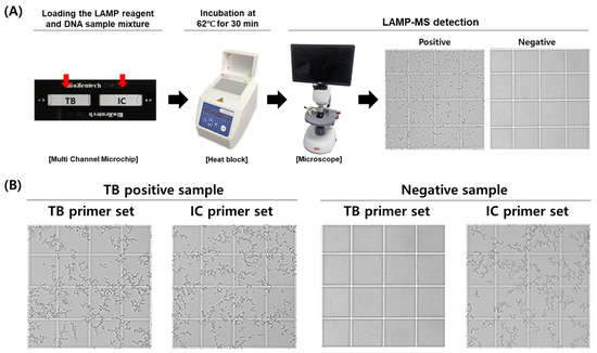 The MTB/IC LAMP-MS assay was developed using a multi-channel microchip system preloaded with primers for the simultaneous detection of Mycobacterium tuberculosis (MTB) and an internal control (IC). The assay involves adding a mixture containing loop-mediated isothermal amplification (LAMP) reagents and clinical DNA samples directly onto the preloaded chips. The loaded microchips are then incubated at 62 °C for 30 min on a heat block. Following incubation, the presence of amplified DNA is visually confirmed through precipitate formation observed under an optical RV400TMCL microscope (OMAX OMB microscope, Bucheon, Republic of Korea), indicating a positive result (Figure 1).