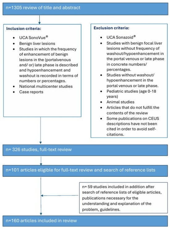 The literature search and analysis were performed specifically for benign liver lesions with hypoenhancement and washout in the LP in CEUS with SonoVue. PubMed was the database searched for entries until 31 December 2024. The keywords and binary operators used are listed in brackets. The summaries were reviewed and suitable articles were selected for further analysis. Similar articles on PubMed database were also checked for relevant abstracts.