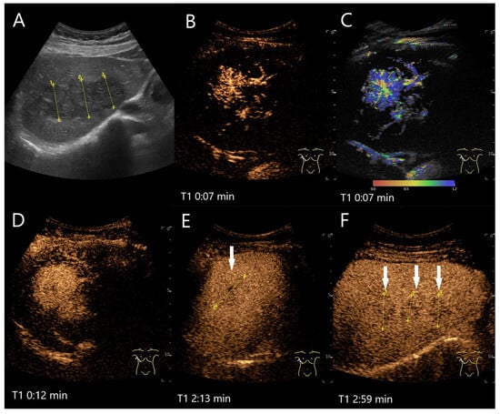 FNH/nodular regenerative hyperplasia newly diagnosed in follow-up care after colon carcinoma and adjuvant chemotherapy with capecitabine and irinotecan. Initially, the lesions with a size up to 30 mm showed a wheel-spoke-like homogeneous hyperenhancement in the AP with isoenhancement in the PVP and LP. Over time, however, hypoenhancement developed in the LP. The images show the lesions three years after the initial diagnosis: the lesions (between the markings) are slightly larger (A). CEUS (B) and parametric imaging (C) show a typical wheel-spoke-like enhancement. In parametric imaging (C), the time of enhancement is displayed in different colors. The lesion is homogeneously hyperenhanced in the AP, a central scar is visible (D). In the LP, the lesions (arrows) are hypoenhanced with emphasis on the central parts (E,F). These lesions were, therefore, not clearly classifiable as benign, particularly in a patient with a history of colon carcinoma. A US-guided biopsy is performed. This revealed findings compatible with FNH and no evidence of metastases.