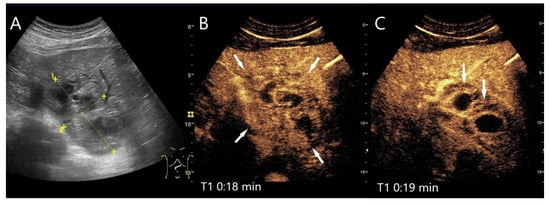 - Dobek, A.; Kobierecki, M.; Kosztowny, K.; Grząsiak, O.; Fabisiak, A.; Falenta, K.; Stefańczyk, L. Utility of Contrast-Enhanced Ultrasound in Optimizing Hepatic Abscess Treatment and Monitoring. J. Clin. Med. 2024, 13, 5046. [Google Scholar] [CrossRef]