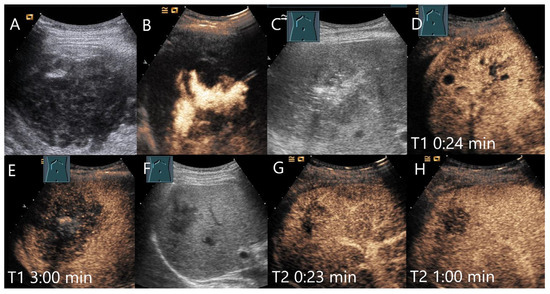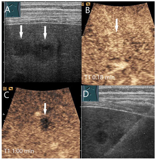 - Chaubal, N.; Thomsen, T.; Kabaalioglu, A.; Srivastava, D.; Rösch, S.S.; Dietrich, C.F. Ultrasound and contrast-enhanced ultrasound (CEUS) in infective liver lesions. Z. Gastroenterol. 2021, 59, 1309–1321. [Google Scholar] [CrossRef]