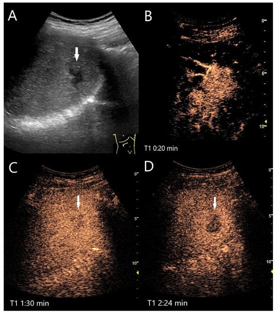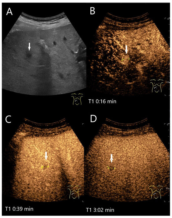 Chronic pyogenic liver abscess. Patient with hypoechoic lesion (arrow) with high inflammatory laboratory (A). CEUS shows mild arterial hyperenhancement after 16 s (B), with mild washout after 1 min (C) and progressive washout after 3 min (D). The US-guided biopsy revealed the histologic diagnosis of a chronic granulocytic sclerosing inflammation.
