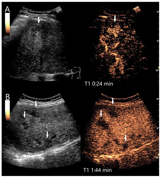 Hepatic sarcoidosis. Hepatosplenomegaly, up to 15 mm hypoechoic lesions in the liver and spleen, generalized lymphadenopathy, and poor general condition. On CEUS, these liver lesions are homogeneously hyperenhanced in the AP (arrow) (A). Washout with hypoenhancement develops from the PVP onwards (arrow) (B). Figure (A,B) show the CEUS image with the corresponding B-mode image in low MI mode. The diagnosis of the hepatic manifestation of sarcoidosis was made by US-guided biopsy of the liver.