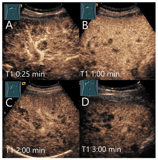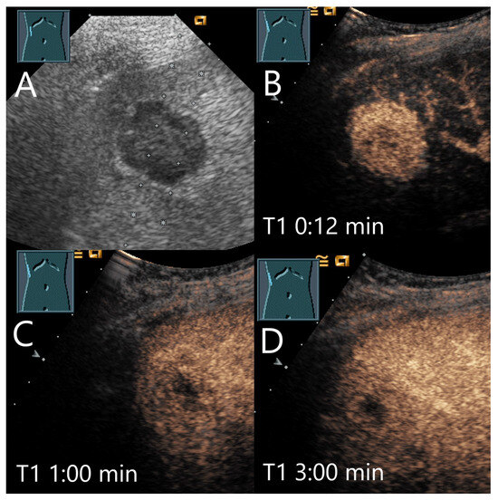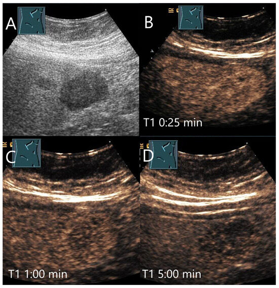 The most common pathogens causing pyogenic abscesses are Escherichia coli and Klebsiella pneumoniae [69]. The consequences of bacterial inflammation are focal arterial hyperemia and the formation of thromboses of the small hepatic and portal veins, as well as pylephlebitis of the small portal venous vessels. Hyperemia is caused by the release of cytokines and an increased arterial perfusion due to thrombosis of the small portal venous and liver veins. In the AP, inflamed hyperemic non-necrotic areas are hyperenhanced. In the PVP and LP, the portal venous and venous thromboses lead to washout [65,69,70,71,72,73,74] (Figure 7 and Figure 8). A classification by Kunze et al. [69] describes the appearance of liver abscesses in B-mode and CEUS in their various stages of development I–IV (with subdivisions) [69]. The washout in abscesses is seen in the initially hyperemic phlegmonous segment, in the liver tissue around the liquidized necroses, in the septa, and to a lesser extent in an already formed fibrous capsule. A simplified classification was proposed by Francica et al. [68,75].