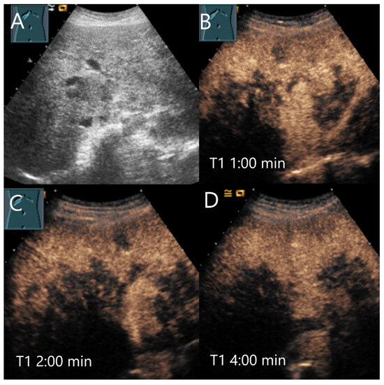 Mycotic liver abscesses are described less frequently. They usually occur in immunocompromised patients [77]. They occur predominantly in the regeneration phase after neutropenia. Histological detection of fungi is rarely successful, as antifungal therapy is carried out as standard in neutropenia. The final diagnosis is made by imaging with corresponding clinical findings [78]. Candida, Aspergillus, Cryptococcus neoformans, and Histoplasma capsulatum were the main frequent pathogens of fungal infections. The lungs, liver, and spleen are the most common organs affected by invasive multilocular fungal infection [79]. In a study of various liver abscesses, the mucoid abscesses were characterized by a hyperechoic inhomogeneous parenchyma [80]. CEUS showed small hyperenhanced lesions with perilesional parenchyma hyperenhancement during the AP and early washout of the small lesions during the venous phase. In addition to medical history, the hyperemia of the surrounding liver parenchyma may be indicative of inflammatory lesions [77,80]. Otherwise, the lesions would also be suspicious for metastases. Görg et al. defined three types of rim enhancement of mycotic abscesses. One of the images shows a type III with homogeneous hyperenhancement after 4 s, then at 12 s, a central hypoenhancement (washout) [78]. Mycotic abscesses are presented in Figure 10.