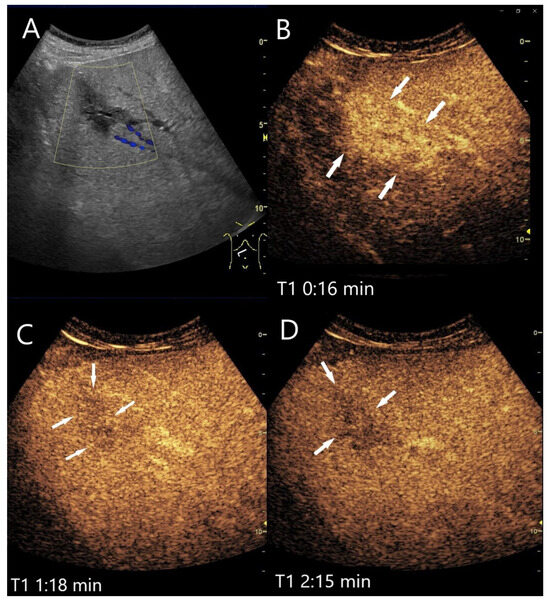 There are few case reports describing the appearance on CEUS where the lesions were hyperenhanced in the AP, followed by washout in the PVP. There was also a slight hyperenhancement of the surrounding liver parenchyma in the AP as an expression of inflammatory hyperemia [83]. This may indicate that it is not metastasis but an inflammatory process. The lesions could be misinterpreted as metastases or primary liver tumors or abscesses of more common bacterial spectrum (Figure 11). The diagnosis is based on the detection of the pathogen in the biopsy specimen.