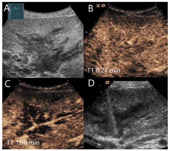 Mycotic abscesses. Acute myeloid leukemia, female patient, condition after neutropenia under antimycotic therapy, now after regeneration of the bone marrow. B-scan US shows multiple hypoechoic FLLs with a maximum size of 10 mm (arrows) (A). CEUS shows a slight arterial hyperenhancement (arrow) after 18 s (B) with clear washout and hypoenhancement after 1 min in the PVP (C). The US-guided biopsy (D) revealed a diagnosis of inflammation without evidence of fungi, clinically corresponding to hepatic candidiasis.