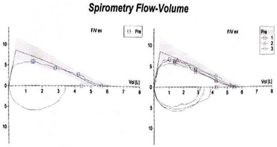 This case involves a 17-year-old high-performance athlete, a non-smoking male, who was initially misdiagnosed with asthma due to persistent wheezing—an atypical symptom for his age. Despite strict adherence to maximum inhalation therapy and the addition of oral corticosteroids, his symptoms persisted. Over time, his condition worsened, progressing from wheezing to exertional shortness of breath and dyspnea with minimal effort. Additionally, he reported stridor, bilateral supraclavicular retraction, and dysphagia. His medical history included multiple documented allergies and allergic rhinitis, with no known exposure to occupational or domestic respiratory irritants. A previous spirometry demonstrated a fixed upper airway obstruction pattern, characterized by flattening of both the inspiratory and expiratory limbs of the flow–volume loop, consistent with significant tracheal narrowing (Figure 1). Follow-up spirometry (Figure 2) showed normal-to-above-average lung volumes, with a maximum vital capacity (VC MAX) of 5.64 L (108%) and a forced vital capacity (FVC) of 5.64 L (106%). The close agreement between VC MAX and FVC suggests no significant dynamic airway collapse or air trapping—a finding typical of fixed upper airway obstruction, such as tracheal stenosis, where flow limitation occurs during both inspiration and expiration but lung volumes remain preserved. Peak expiratory flow (PEF) and mid-expiratory flows showed some variability, with MEF25 slightly elevated (102%), likely reflecting normal physiological variation rather than small airway pathology. Overall, these findings indicate preserved lower airway function, with the flow limitation primarily attributable to the fixed upper airway obstruction. It is important to mention that the spirometry was performed in a medical facility located in the patient’s county of residence. After admission to our unit, considering the patient’s clinical condition marked by severe dyspnea, it was no longer feasible to perform this investigation.
