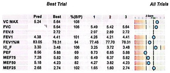 Spirometry results. Key parameters include elevated VC MAX and FVC values, normal FEV1, and a slightly reduced FEV1/FVC ratio. PEF and mid-expiratory flows demonstrate variability, while MEF25 exceeds predicted levels, indicating preserved distal airway function. The Z-score bars display each test result’s deviation from predicted normal values, based on the patient’s demographic profile. Stars mark the measured values along a scale ranging from −5 to +3. Clinically, results falling within ±1.64 Z-score are considered within the normal range; values beyond this suggest potential respiratory impairment.