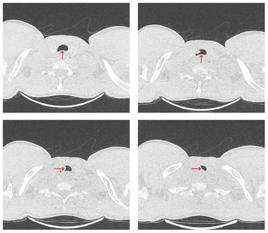 The patient’s post-procedural course was favorable, with stabilization of respiratory function and no evidence of hypoxemia, either at rest or with moderate effort. A follow-up CT scan was performed, partially correlating with the initial imaging findings. The scan revealed a residual tumor mass measuring 5.7 × 3.2 × 5.1 cm, located posterior to the tracheal lumen, near the site of the prior tumor resection and stenting. This mass exerted significant compressive effects on the trachea, reducing the minimal luminal width to 22 × 4 mm, and also affected the esophagus (Figure 7). In the right pulmonary hilum, a polynodular, well-defined mass measuring 4.38 × 3.31 cm was identified, causing mild compression of the regional bronchi (Figure 8), suggesting possible adenopathy. Pulmonary vessels are patent, with isolated perihilar ground-glass opacities and resolved pneumomediastinum.