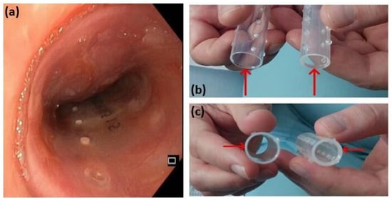 A Dumon stent (a); comparison between the two Dumon stents of different wall thickness (b,c). The initial stent, on the left, with a diameter of 18 mm and a wall thickness of 1 mm, was replaced with the stent on the right, with a diameter of 16 mm and a wall thickness of 1.5 mm, to address persistent tracheal instability.