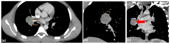 Chest CT scan with contrast from 24 July 2024—axial plane (a) and coronal plane (b,c), identifying a polynodular, well-demarcated mass in the right pulmonary hilum, measuring 4.38 × 3.31 cm (red arrow).