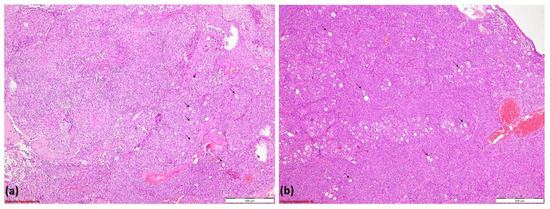 Hypercellular tumoral proliferation with a solid pattern of growth and zonal luminal development (→); HE, 40× (a); tumoral nests composed of large neoplastic cells with eosinophilic or clear cytoplasm and vesicular nuclei. Tumoral nests are divided by delicate fibro-vascular septa (→); HE, 100× (b).