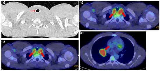PET-CT scan from 31 July 2024: (a) axial plane showing post-stenting recalibration of the tracheal lumen (red arrow); (b–d) axial plane showing a hypermetabolic tumor mass in the cervico-mediastinal posterior region, measuring approximately 55 × 65 mm axially and 45 mm cranio-caudally (red arrows). The lesion is inseparable from the posterior thyroid lobes; (d) the axial plane identifies a metabolically active, well-defined mass in the right pulmonary hilum, consistent with adenopathy (red arrows).