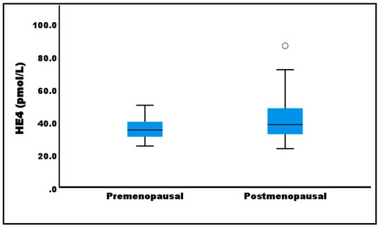 Box plots of serum HE4 levels according to the menopausal status. The whiskers show the maximum and minimum values, with the exception of outliers (circles).
