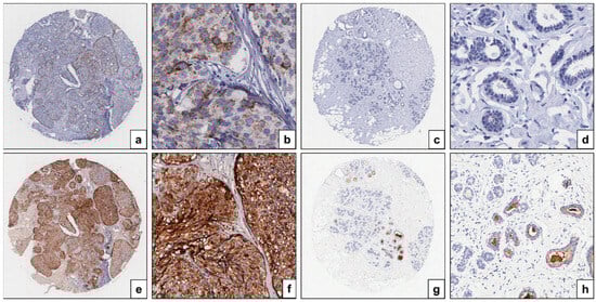 HE4 mRNA and protein expression levels in breast cancer tissues have previously been investigated using real-time PCR and immunohistochemistry [18,20,21,22]. Immunohistochemically, HE4 is generally localized to the cytoplasm of breast cancer cells, and expression has also been reported in normal breast ductal epithelium [20,22]. The reported frequency of HE4 positivity in breast cancer varies widely (9.6–98.8%), depending on the scoring criteria employed [18,20,21,22]. For instance, Mirmohseni Namini et al. observed HE4 positivity in only 3 of 31 (9.6%) breast cancer tissues, with no expression detected in adjacent normal tissues [18]. Several studies have also shown that HE4 mRNA expression is significantly higher in tumor tissues compared to adjacent normal tissues [18,21].