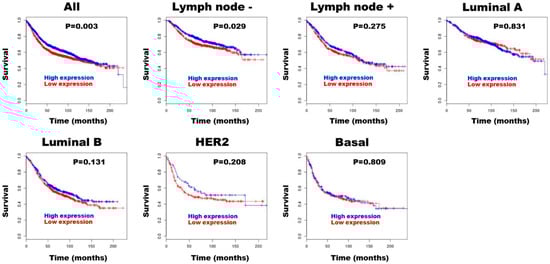 BreastMark analysis revealed that higher HE4 expression was significantly associated with improved survival in both the overall breast cancer cohort (HR = 0.838, 95% CI: 0.75–0.94, p = 0.003, n = 2652) and the lymph node-negative subgroup (HR = 0.791, 95% CI: 0.64–0.97, p = 0.029, n = 1183) (Figure 4).