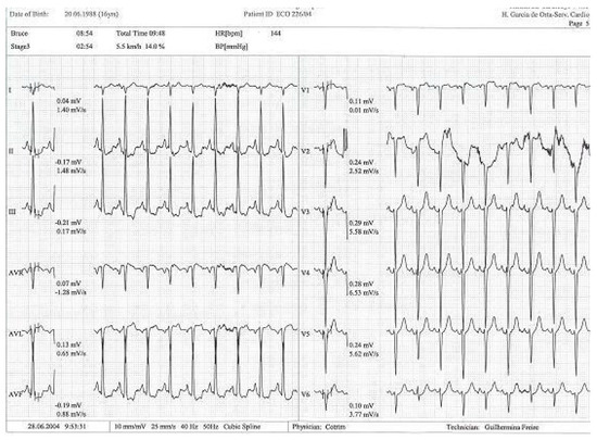 Exercise test with alteration in ST segment in DII, DIII, and avF [14].