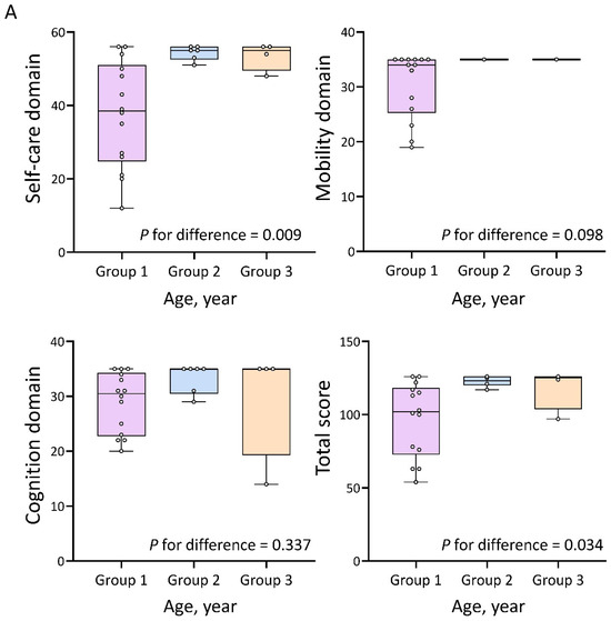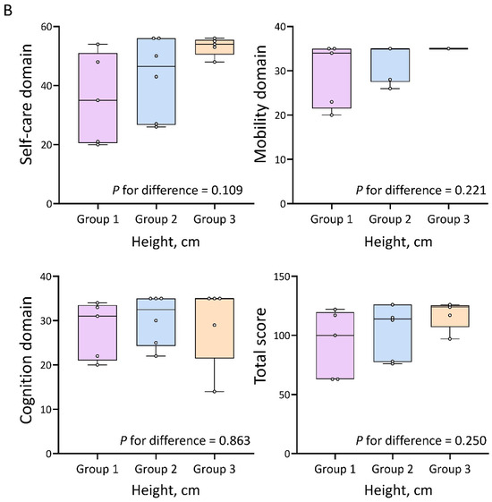 The total WeeFIM score of the enrolled children ranged from 54 to 126 (median 117). Table 1 summarizes the total, mean, median, and IQR scores for each domain in the three age groups. The mean total WeeFIM score in the overall cohort was 106.9 ± 23.2 (range: 54–126), and the mean self-care, mobility, and cognition scores were 44.4 ± 13.8 (maximum 56), 32.4 ± 5.1 (maximum 35), and 30.2 ± 6.0 (maximum 35), respectively. The median IQR scores for the self-care, mobility, and cognition domains were 50.5 (36.5–55.5), 35.0 (33.5–35.0), and 32.0 (27.0–35.0), respectively. When grouped by age, significant differences were observed between groups in the self-care domain and total WeeFIM scores. The box plot in Figure 1A illustrates the distribution of scores across the self-care, mobility, and cognition domains, as well as total WeeFIM scores. The 16 children with recorded height data were divided into three groups based on height, from shortest to tallest. However, no significant differences were found between the height groups in self-care, mobility, or cognition domains, or in total WeeFIM score (Table 2). Figure 1B presents a box plot illustrating the distribution of self-care, mobility, cognition, and total WeeFIM scores among the participants grouped by height.