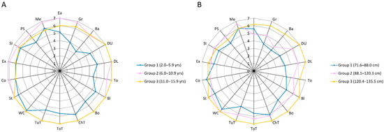 (A) WeeFIM profiles of the study participants stratified by three age groups; (B) WeeFIM profiles of the study participants stratified by three height-based groups. Ba = bathing; Bl = bladder; Bo = bowel; ChT = bed/chair/wheelchair transfer; Co = comprehension; DL = dressing (lower); DU = dressing (upper); Ea = eating; Ex = expression; Gr = grooming; Me = memory; PS = problem-solving; SI = social interaction; St = stairs; To = toileting; ToT = toilet transfer; TuT = tub/shower transfer; WC = walk/wheelchair.