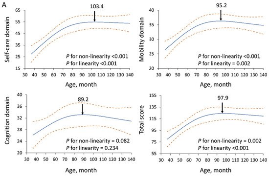 We utilize restricted cubic splines in Figure 3 to visualize the relationships between age, height, and WeeFIM scores. The results show that the relationship between age and WeeFIM scores was generally nonlinear, except for the cognition domain, where the nonlinearity significance was 0.082. A clear positive linear correlation was observed before school age (approximately 72 months), after which the scores plateaued at varying ages depending on the specific WeeFIM domains (Figure 3A). By contrast, the relationship between height and WeeFIM scores was generally linear, except for the cognition domain (p for linearity = 0.608) (Figure 3B).