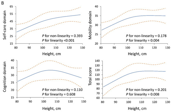 (A) Linear and nonlinear relationships of age-related trends in self-care, mobility, cognition, and total WeeFIM scores. (B) Linear and nonlinear relationships of height-related trends in self-care, mobility, cognition, and total WeeFIM scores. The solid blue line represents the predicted mean score based on a restricted cubic spline regression model and the dashed orange lines represent the 95% confidence intervals of the predicted scores.