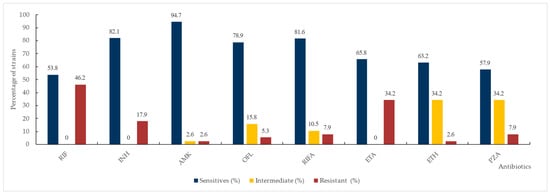 Our analysis, conducted between 2019 and 2022, preceded the current WHO definitions. Consequently, we did not perform tests regarding susceptibility to newer drugs, such as linezolid, bedaquiline, moxifloxacin, and levofloxacin. According to the WHO recommendations, the first-line treatment for drug-sensitive TB (both pulmonary and extrapulmonary) consists of a six-month regimen of four antibiotics: isoniazid, rifampicin, ethambutol, and pyrazinamide [2,3]. While this regimen remains effective for most cases, our analysis found that 91.84% of the strains from southern Poland were susceptible to all first-line drugs. Therefore, resistance to isoniazid (8.8%) and rifampicin (6.8%) highlights the need for tailored treatment strategies and close monitoring. Resistance to these key drugs is often a marker for MDR-TB, necessitating second-line treatments [20].