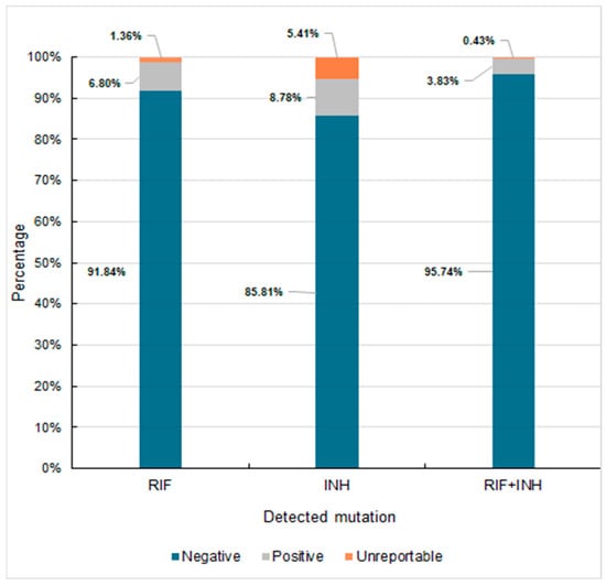 The statistical analysis was performed using PQStats 1.8.6.102. The parameters for diagnostic tests detecting MTBC were calculated along with the 95% confidence interval (CI). The agreement of rifampicin and isoniazid gene detection results was determined using the Kappa–Cohen concordance test. p-values < 0.05 were considered significant.