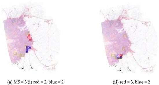 To identify regions of diagnostic interest, we compute mitotic hotspots (MHs)—circular areas with the highest estimated mitotic activity. Each patch, p, containing a mitotic figure is assigned a hotspot score , defined as follows: