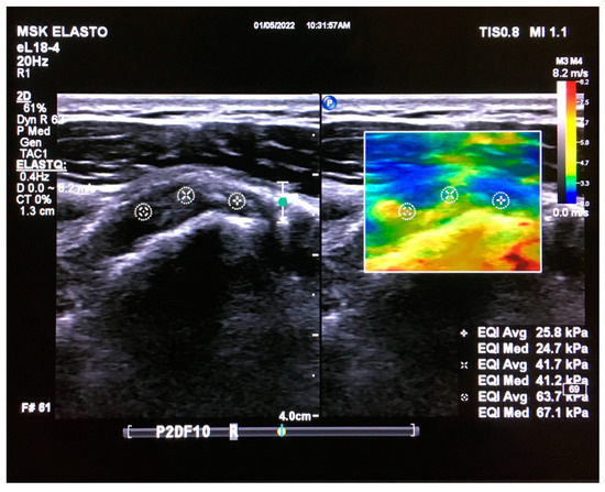 The conventional B-mode ultrasound image was displayed on the left side of the screen adjacent to the color-coded real-time elastogram on the right side of the screen. The transparency of the color was optimally adjusted to allow the underlying grayscale image to be visible through the superimposed color map. The color code displayed the relative stiffness of the tissues within the ROI, which ranged from blue (soft) to red (stiff). Green and yellow indicated medium elasticity (Figure 1).