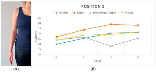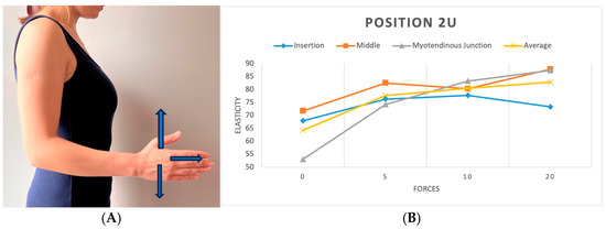 (A) Position 2 in three directions (upward, downward, and forward). (B) Plot showing elasticity across tendon regions with varying forces in position 2 (upward).